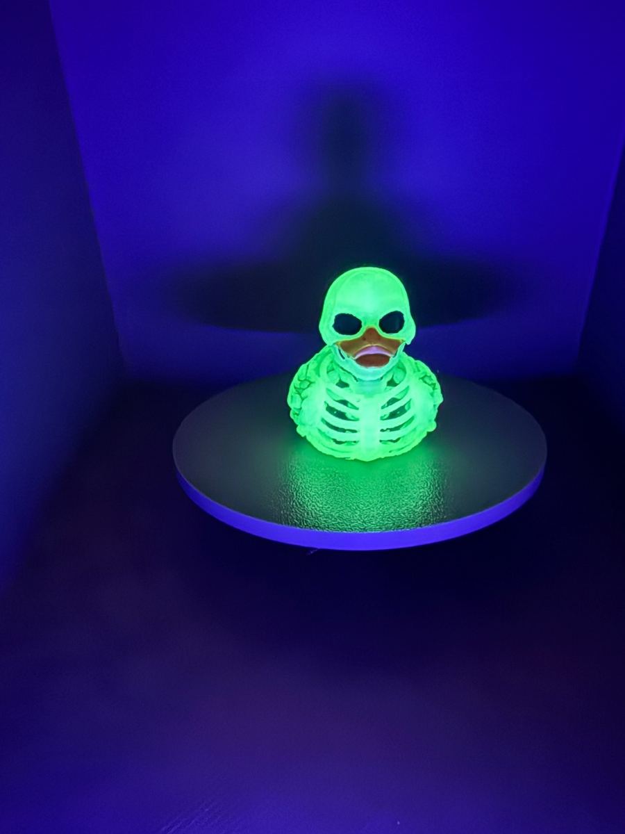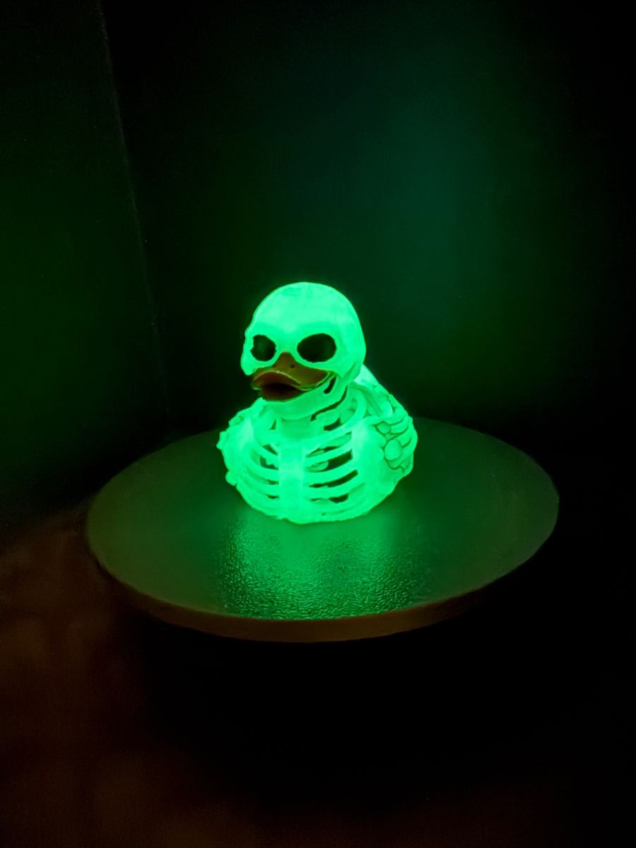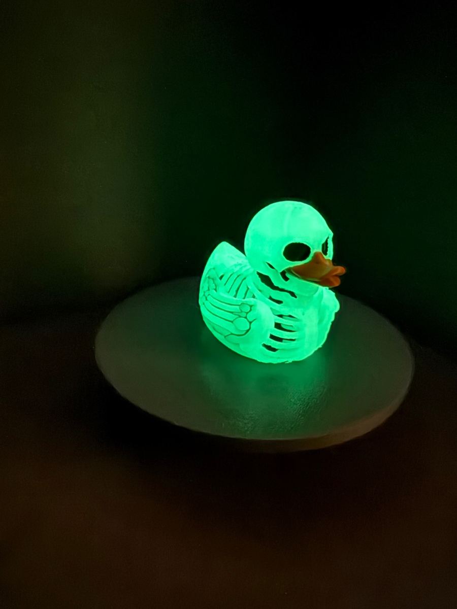 Same skeleton duck, printed in glow-in-the-dark filament. Charge it up under any light and watch it haunt the dark. Festival-ready. Concert-approved. 🌙