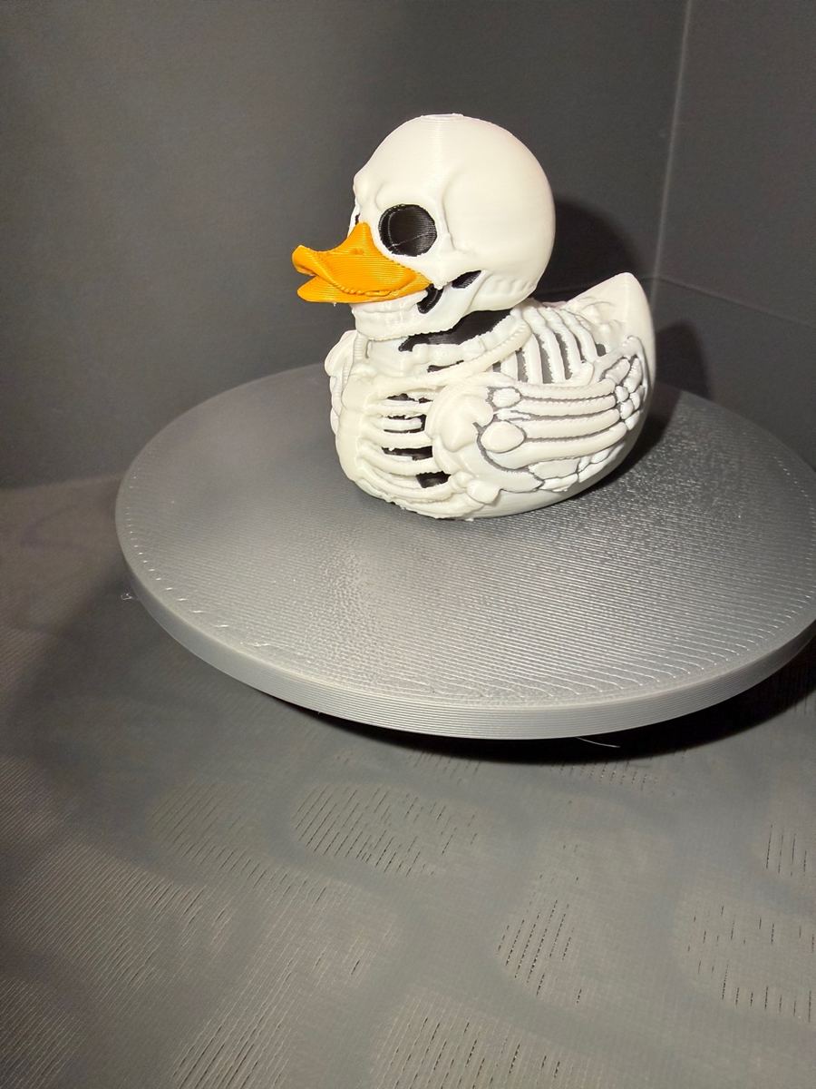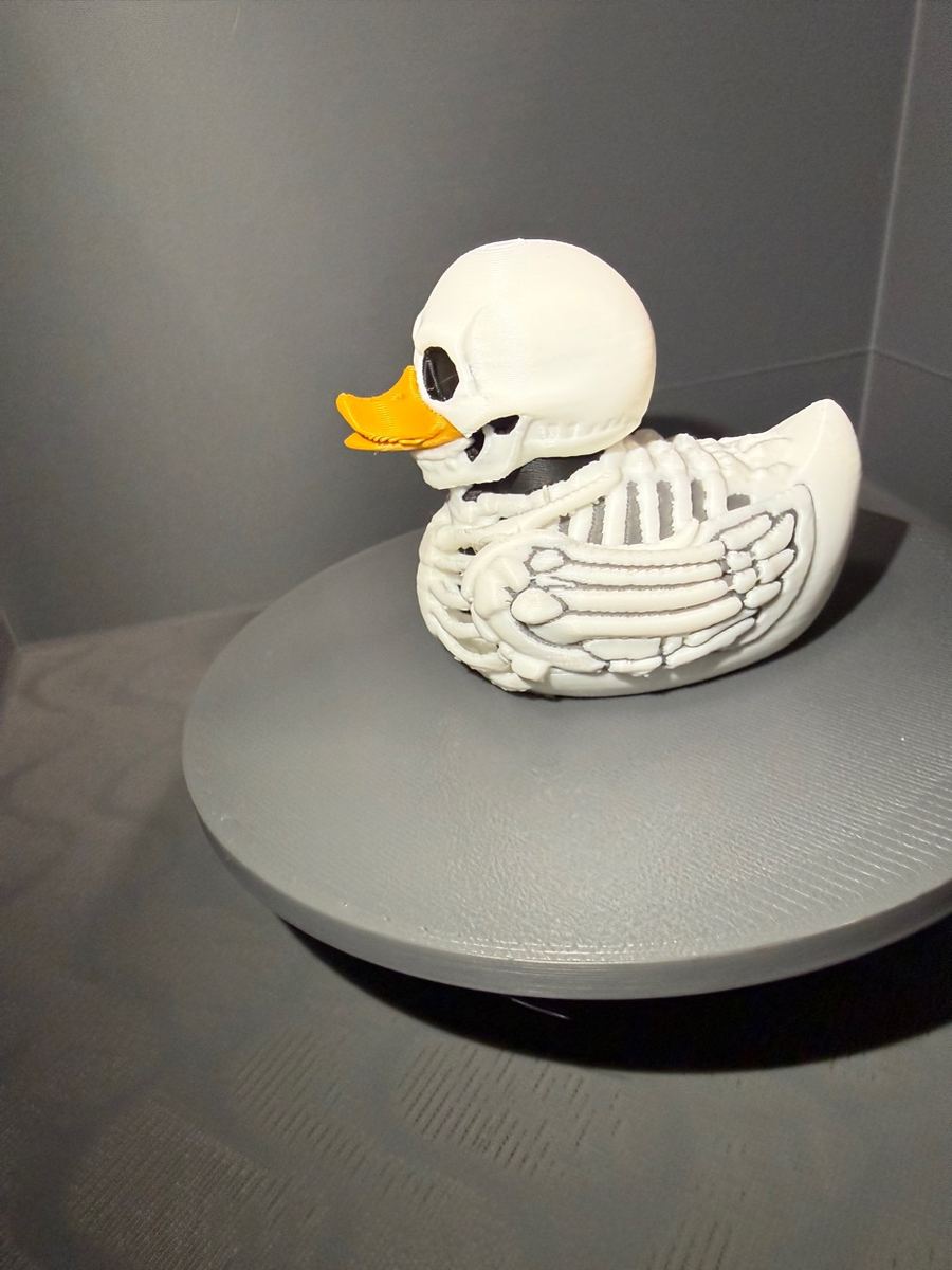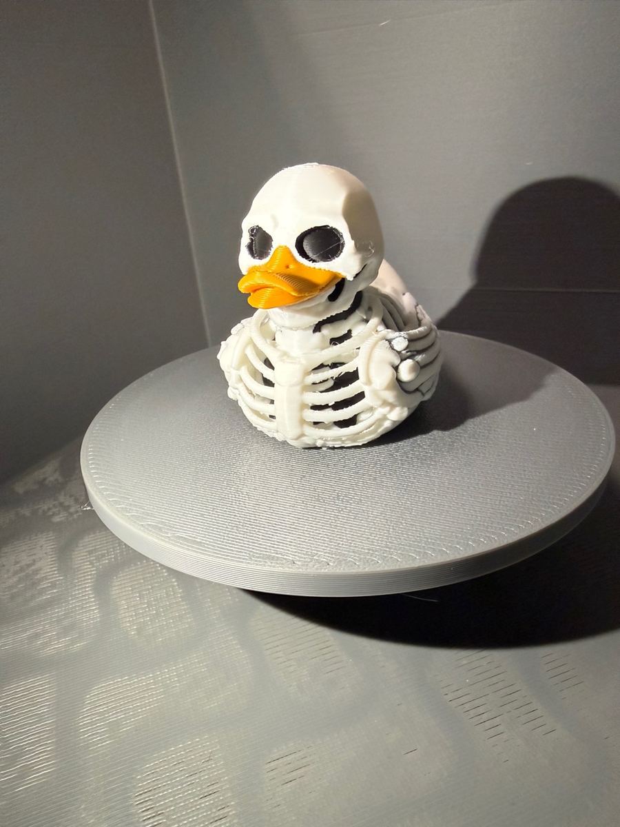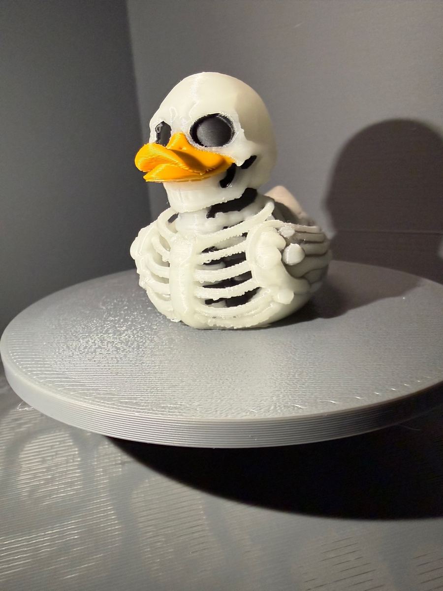 Same skeleton duck, printed in glow-in-the-dark filament. Charge it up under any light and watch it haunt the dark. Festival-ready. Concert-approved. 🌙